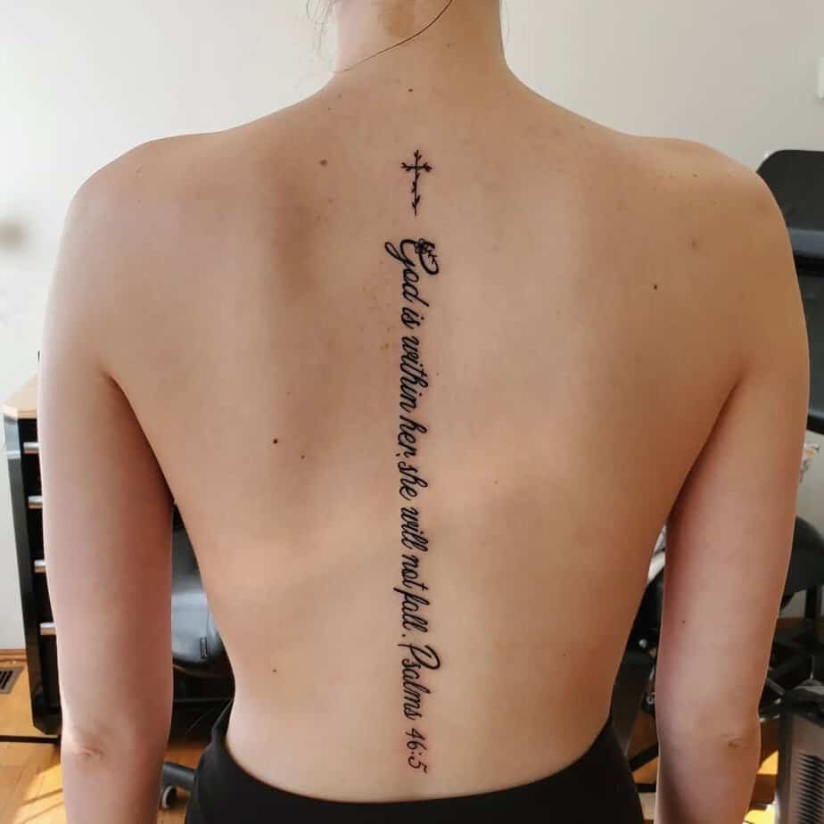 Okay, picture this: the quote “God is within her, she will not fall” running down your spine. It reads bold and intentional, like your faith is the pillar you lean on every day. I love how literal and symbolic that is — having your back covered in the truest sense.