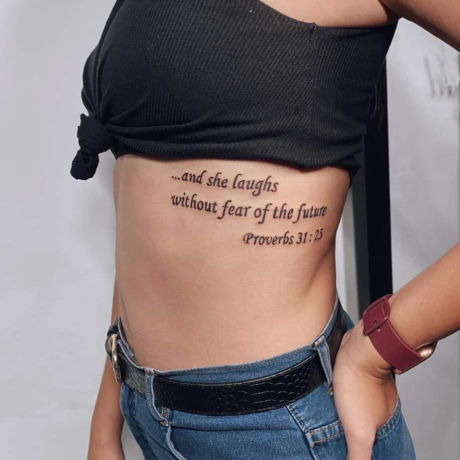 “And she laughs without fear of the future” right above the ribs — fierce, playful, and kind of intimate. It’s like your faith secretly tickles you into courage whenever the future tries to look scary.