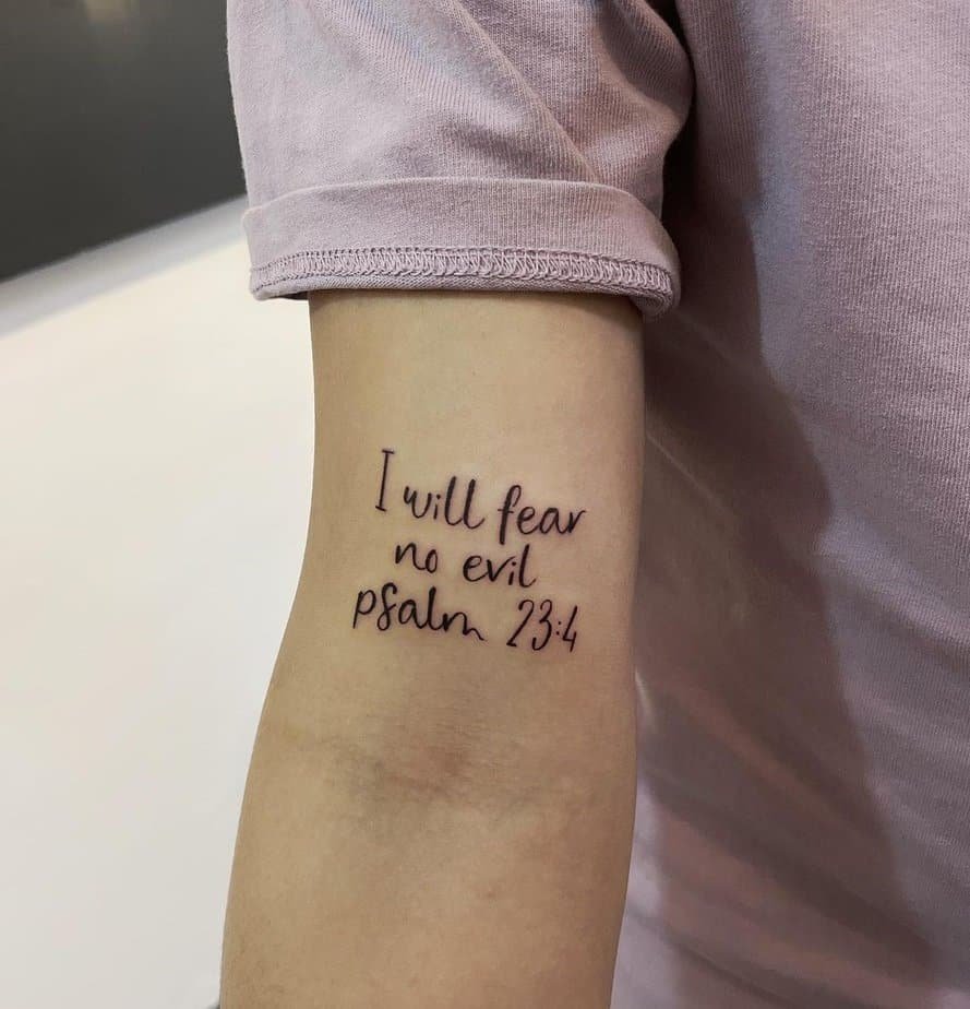 “I will fear no evil” inked on the arm reads like a personal mantra and a warning to anything thinking about messing with your peace. It’s practical courage — and when you flex, it’s like announcing you’re protected.