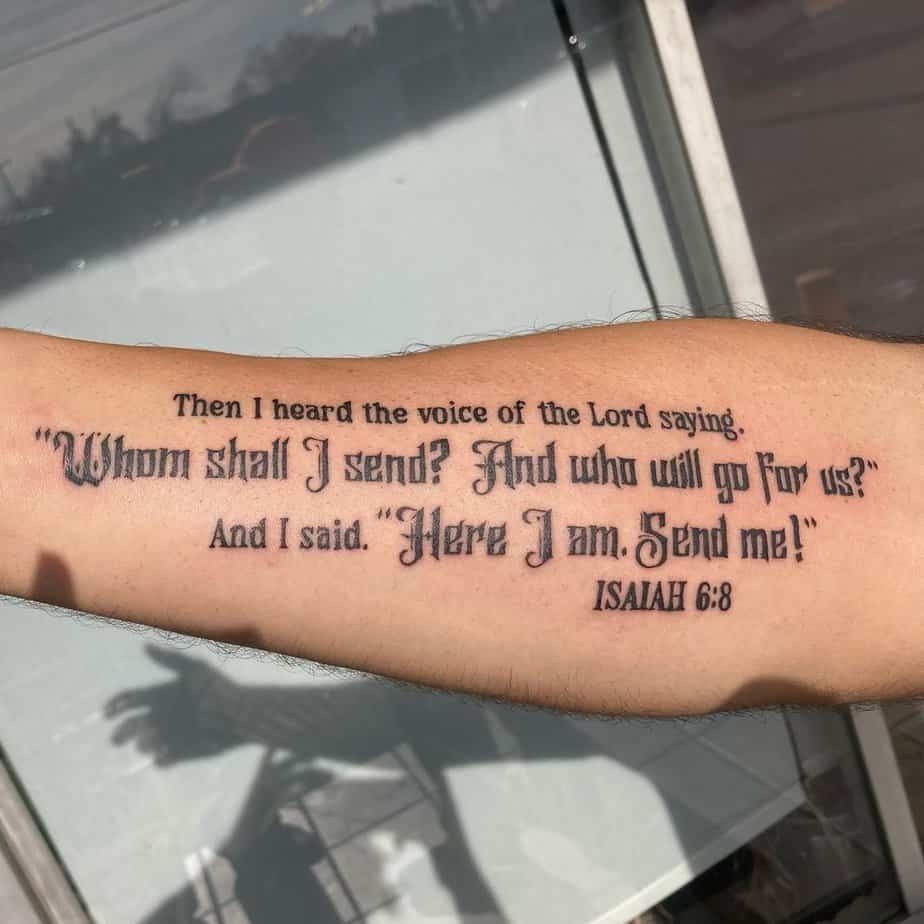 Isaiah 6:8 on the forearm feels like shouting your yes to the world — or whispering it, if you’re more low-key. It’s readiness in ink: whether it’s divine calling or just being present for your folks, it’s a brave little statement.