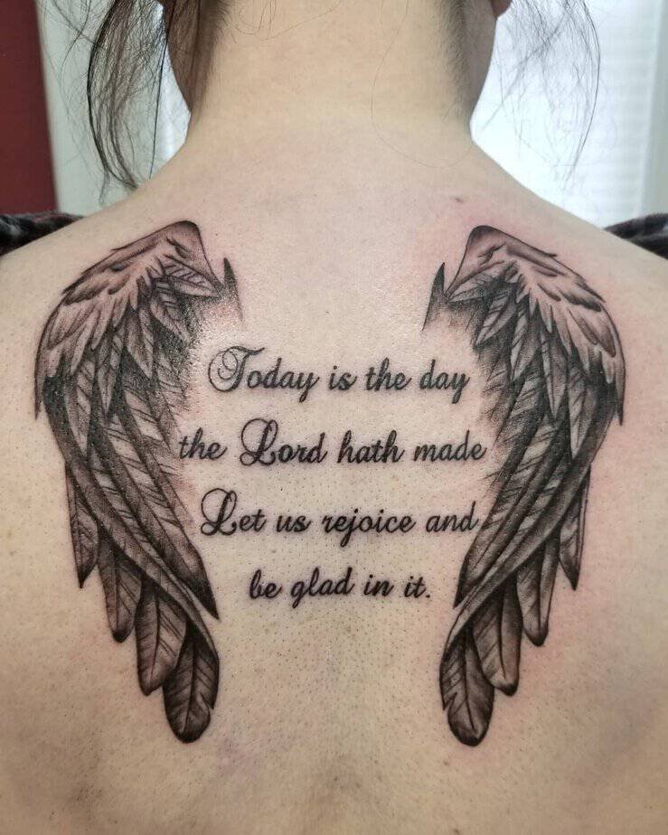 “This is the day the Lord hath made; let us rejoice and be glad in it” paired with wings feels like waking up to a sunrise painted on your back. It’s joyful and grand — the kind of art that makes you stand a little taller.