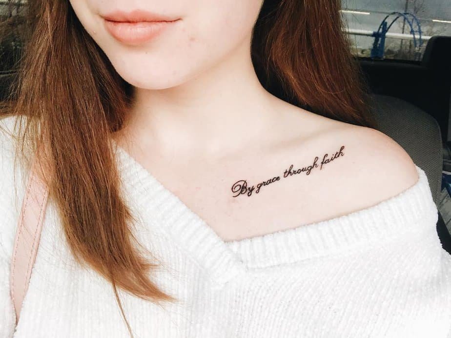 “By grace through faith” along the collarbone is like wearing a delicate chain made of meaning. It’s visible, graceful, and quietly profound — the kind of line that feels like a personal mantra.