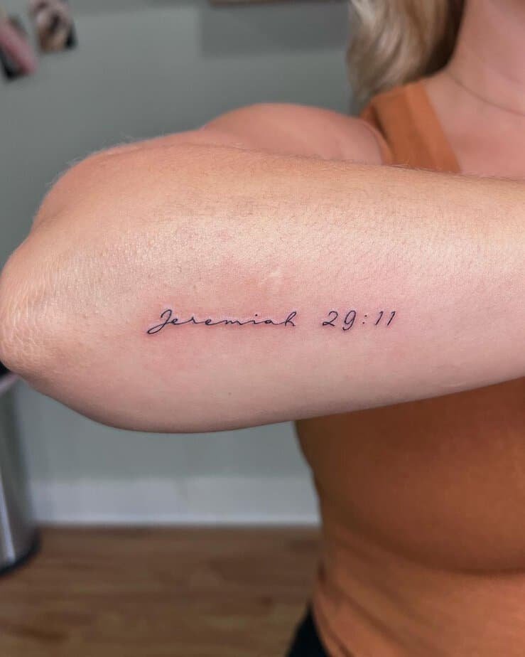Jeremiah 29:11 on the arm is the softest pep talk: a whisper that promises hope and plans when you need reassurance. It’s the kind of ink that calms your pulse in the noise of the day.