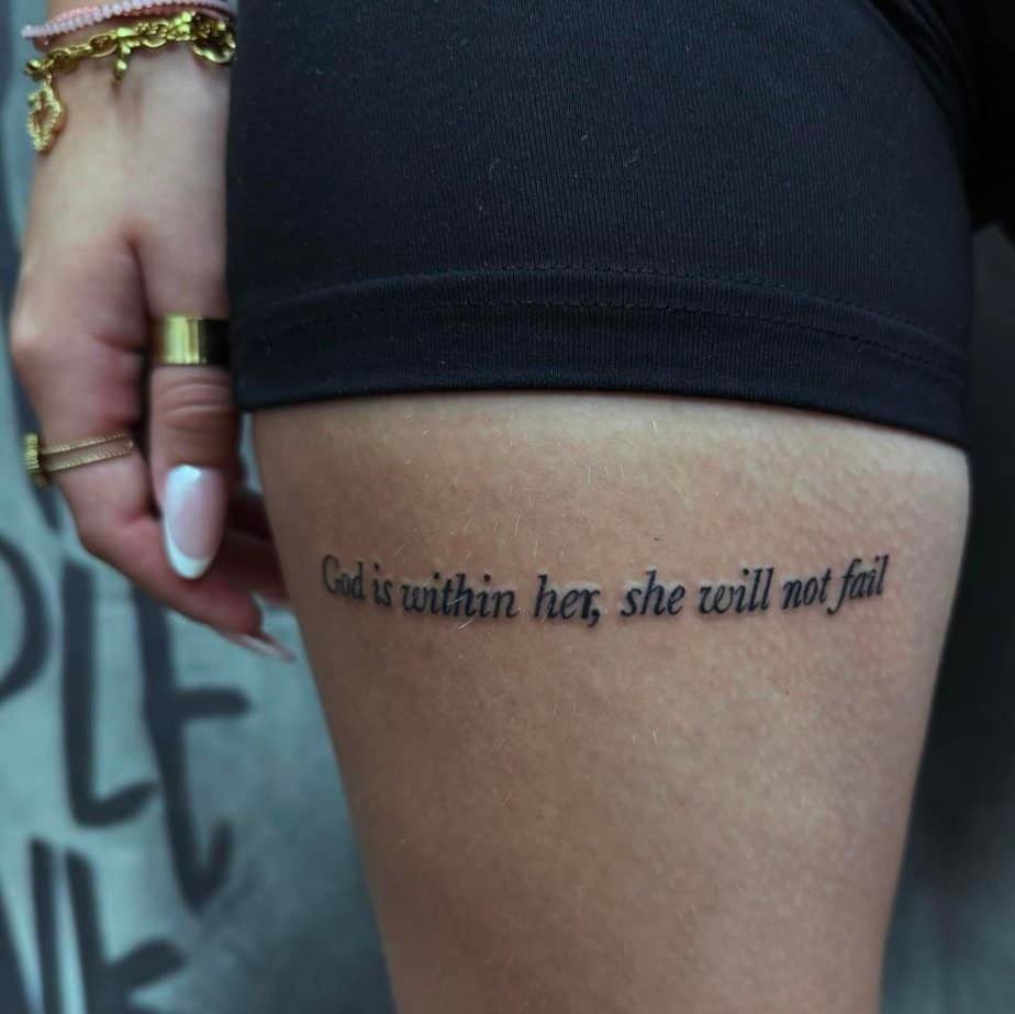 Same powerful line — “God is within her, she will not fail” — but on the inner thigh, so it’s this quiet, personal boost you carry around. It reads like a secret talisman: only you know how much it steadies you when days get heavy.