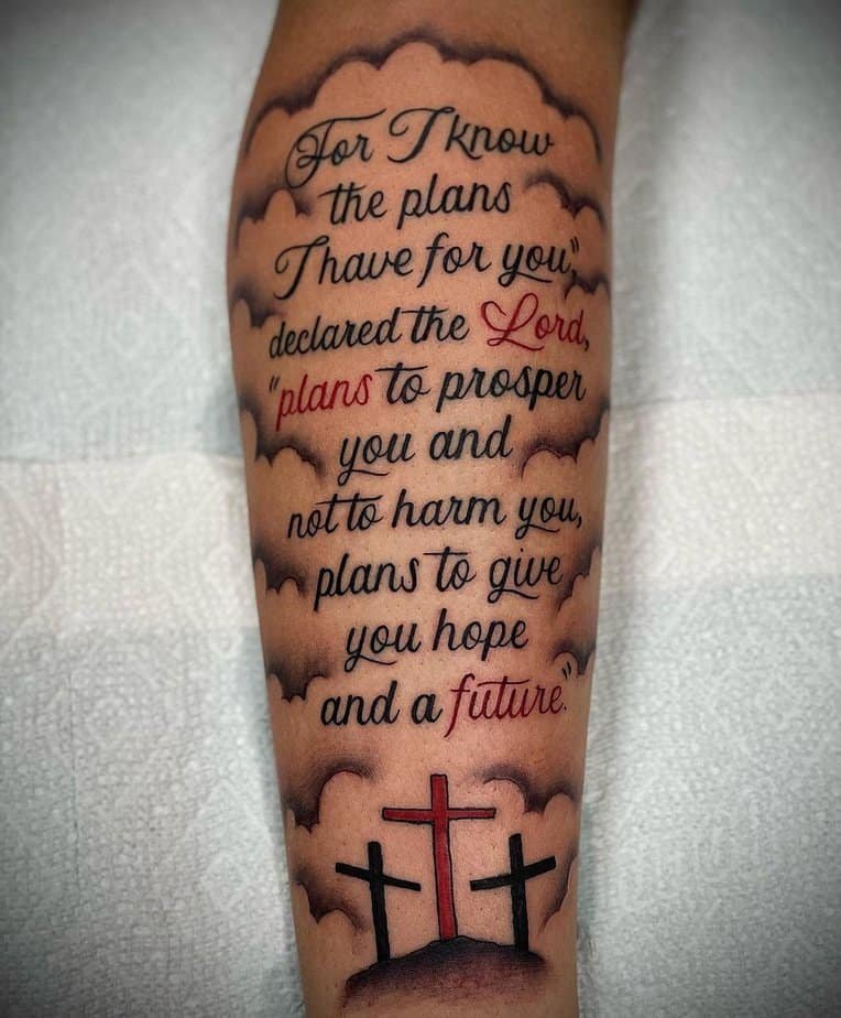 A Jeremiah quote with little crosses and clouds turned into a tiny sky on your arm — this one reads like a lifelong reminder that someone’s got a roadmap for you. It’s comforting, optimistic, and somehow steadying when life feels chaotic.