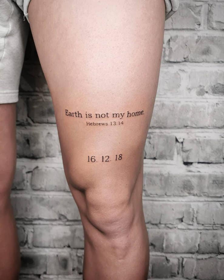 “Earth is not my home” is short, poetic, and so quietly profound. Placed on the thigh, it’s unassuming but heavy with meaning — like a reminder that this chapter is temporary and there’s something more waiting.