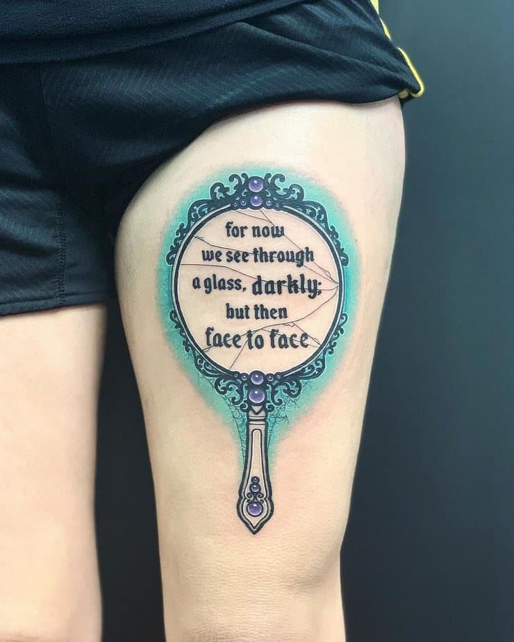 “For now we see through a glass, darkly” tucked into a vintage mirror design is mysterious and beautiful. It’s the kind of tattoo that says life’s answers might be blurry now, but faith promises clarity eventually. I live for tattoos that feel contemplative like that.