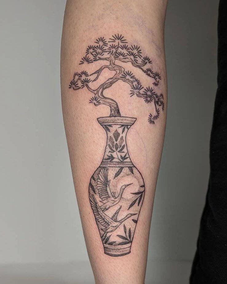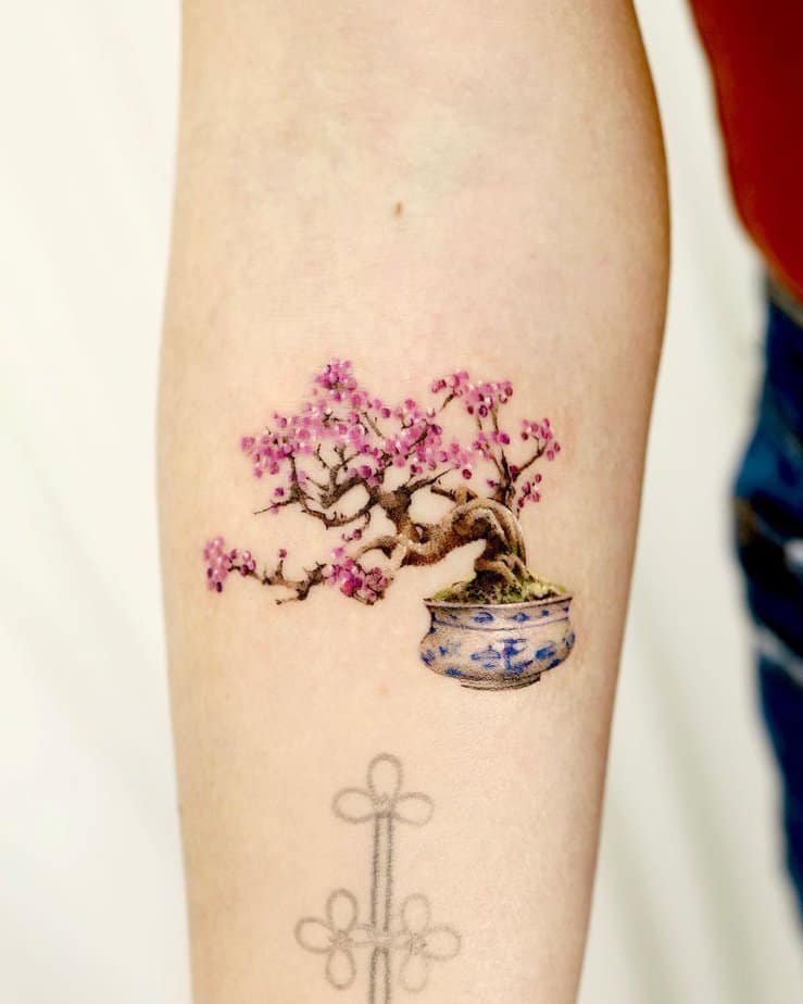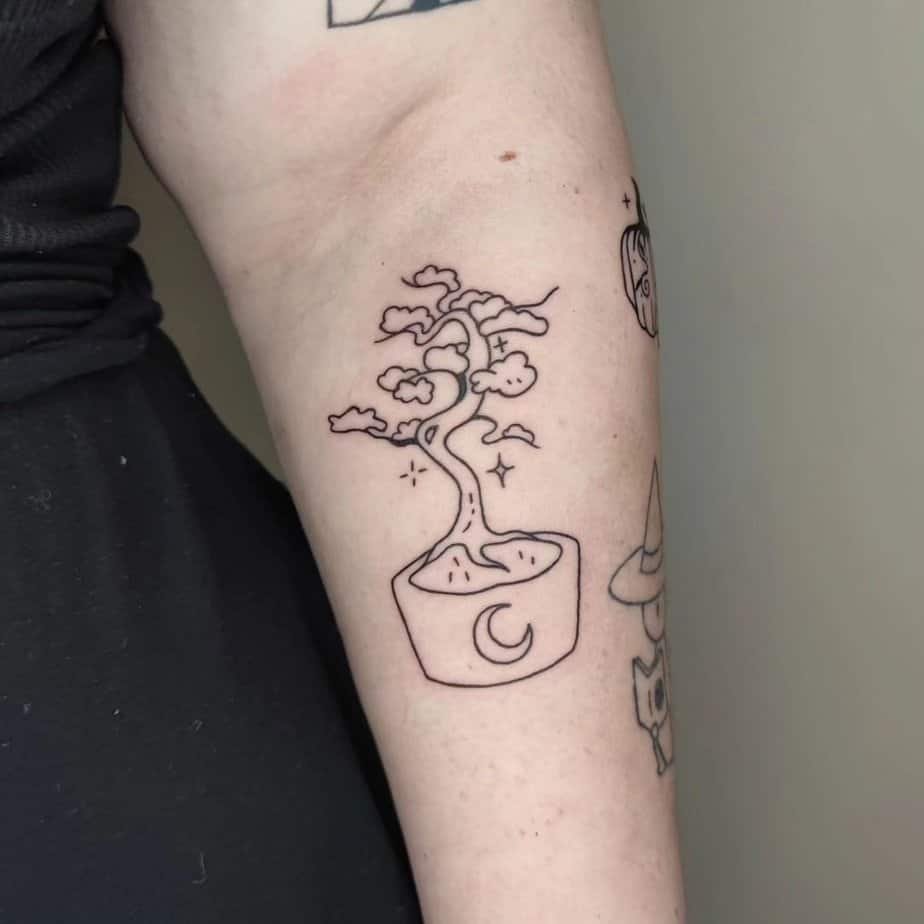 This whimsical design turns the bonsai into a hand with flowers and leaves drifting out, all floating on a cloud. It’s colorful, dreamy, and the kind of tattoo that makes people smile and want to know the story behind it.