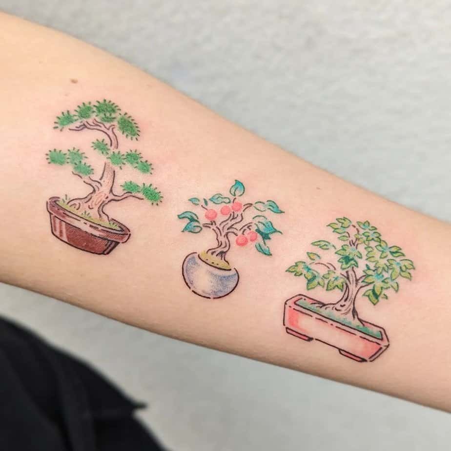 This one’s pure charm — three little bonsai lined up like they’re on a windowsill. The colors make it cheerful and optimistic, the kind of tattoo that reminds you to appreciate small, happy moments.