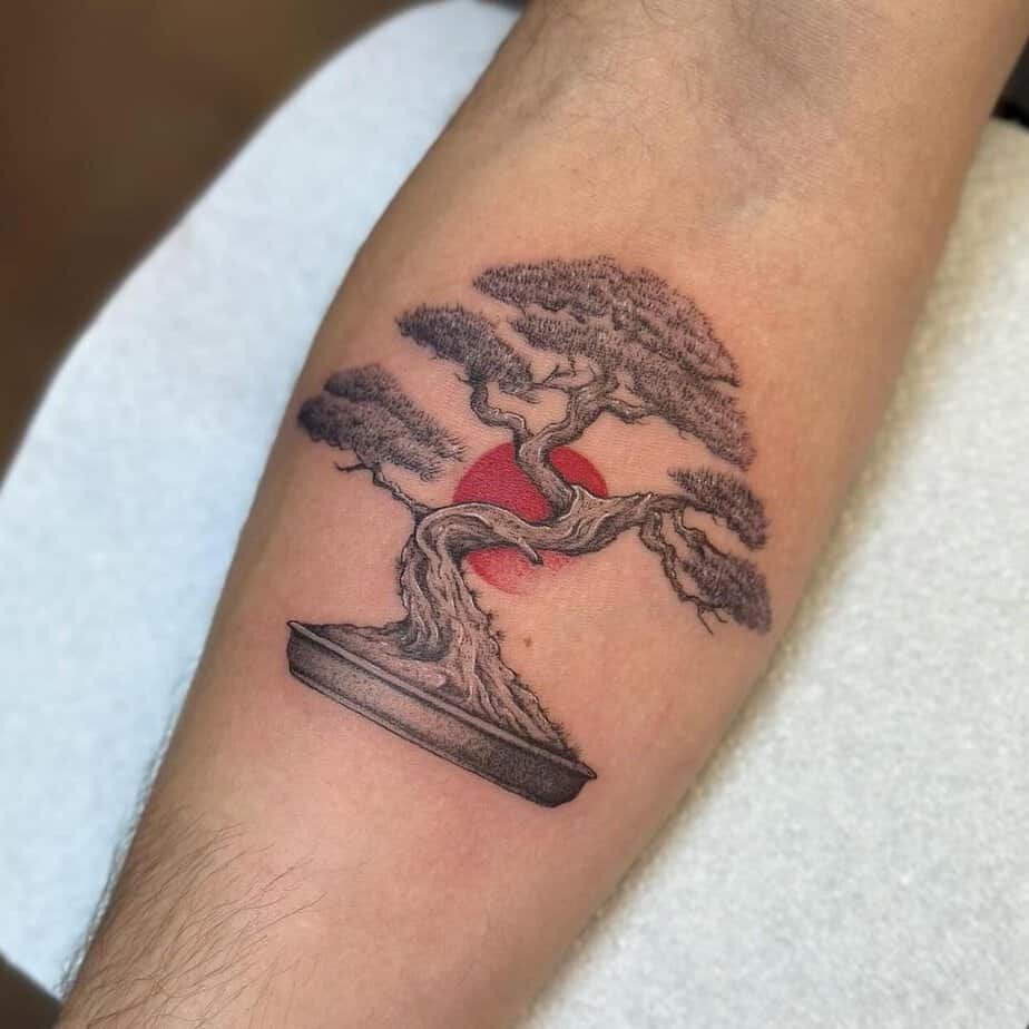 A black bonsai whose roots flow into an enso circle, with a red sun behind it — this one’s heavy with Zen symbolism. The enso is about a mind that’s free, complete, and open, so pairing it with a bonsai brings together inner peace and the work of tending your life.