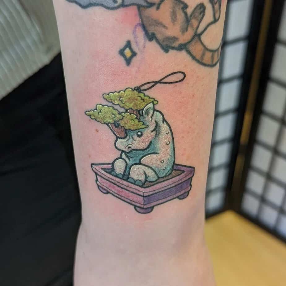 A small, colorful rhino sitting in a pot with a bonsai sprouting from its horn — how charming. Rhinos symbolize strength and protection, so this one reads like a playful armor: soft in design, strong in meaning.