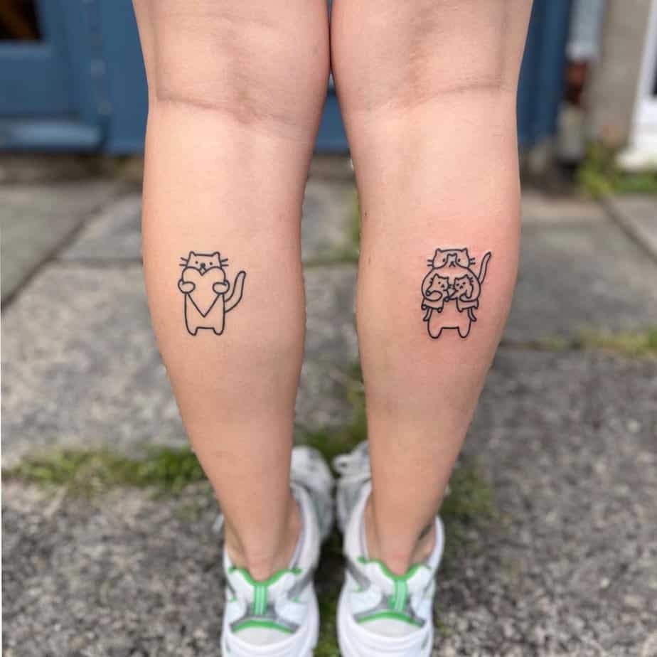 These matching calf pieces are adorable: one cat stands on its hind legs holding a heart, the other cradles two kittens. It’s playful, heartwarming, and perfect if you love the idea of twin or paired tattoos.