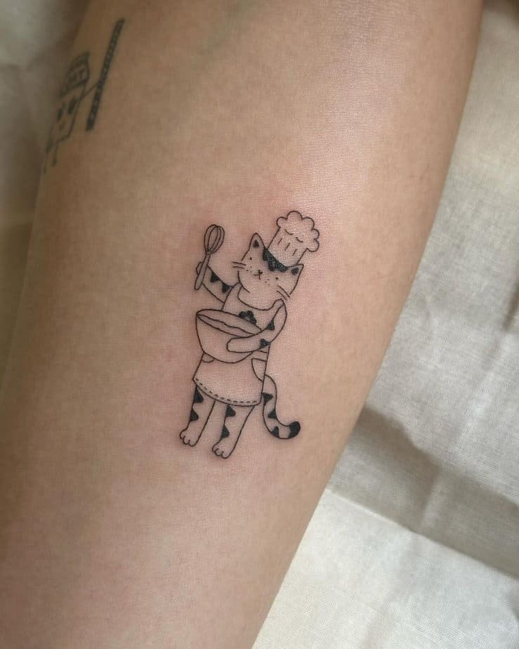 This playful design shows a cat standing upright, wearing an apron, holding a whisk and a bowl, complete with a chef’s hat. There are little black spots for extra character. It’s fun, creative, and perfect if you love cooking and cats equally.