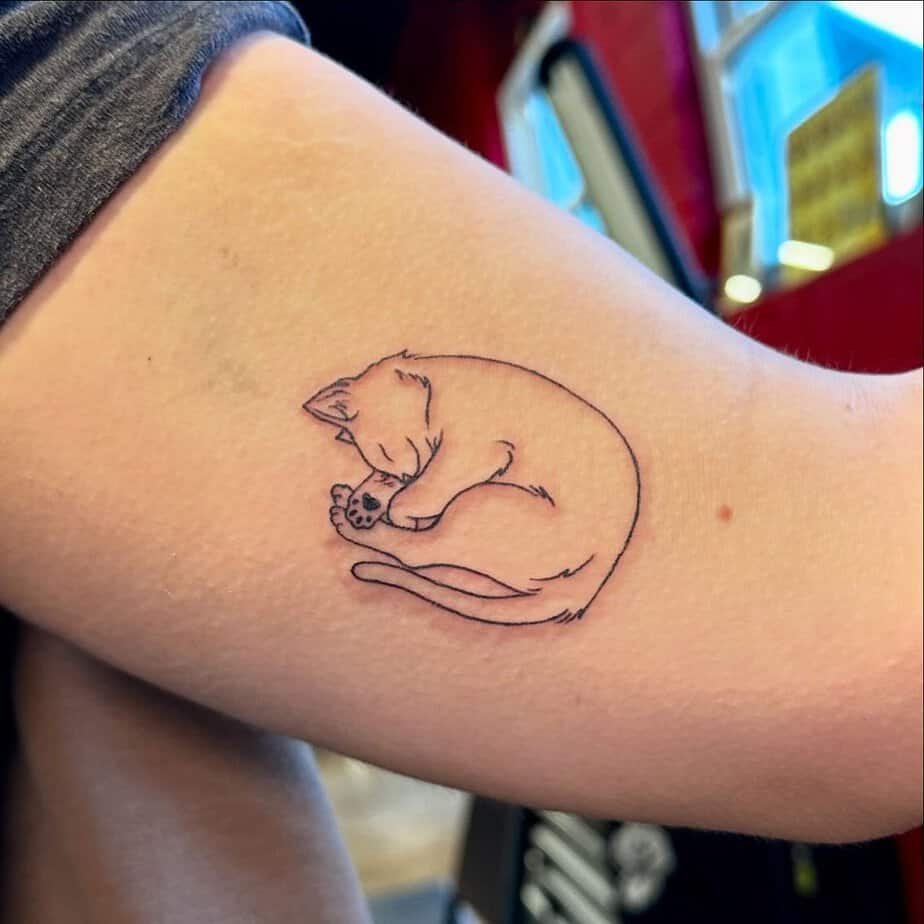 This cat is fully relaxed, stretched and napping — and honestly, it’s a tiny reminder to take a breath and do less. The design feels like a symbol of independence and gentle self-care, the kind of tattoo that quietly says, “it’s okay to rest.”