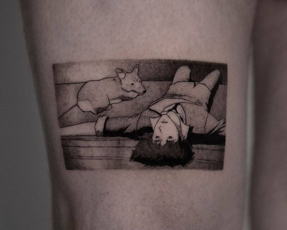 If you want ink that says “ride or die” without shouting, this bro-y, black-and-white piece is a keeper. It captures Spike and Jet’s quiet, unspoken brotherhood — the kind of friendship that’s built on history, grudging respect, and showing up. It’s classic and earnest.