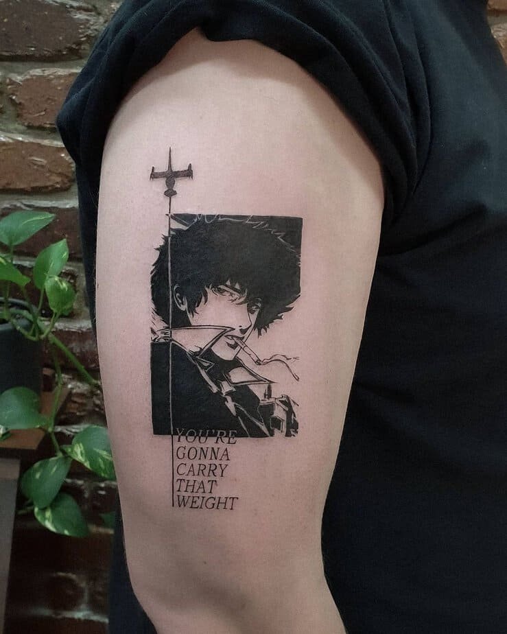 This monochrome upper-arm piece is quietly devastating in the best way. Spike staring into the distance, cigarette in hand, and the Swordfish II slipping off into space above him — paired with the line “You’re gonna carry that weight.” It’s one of those tattoos that feels like a personal mantra about grief and moving forward, imperfectly carrying all the stuff we don’t always talk about.