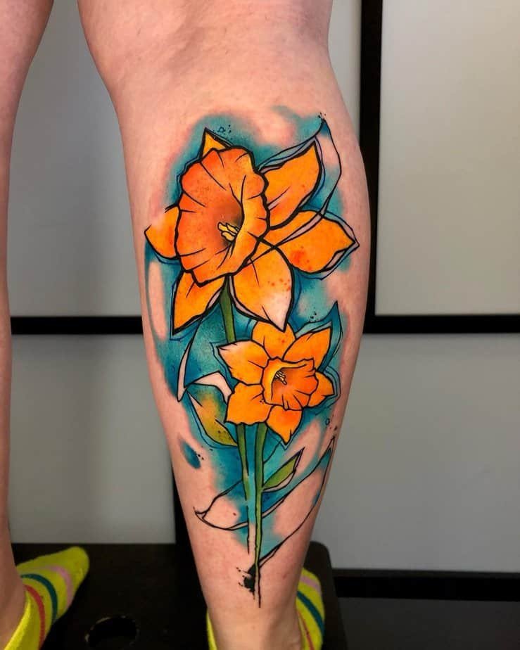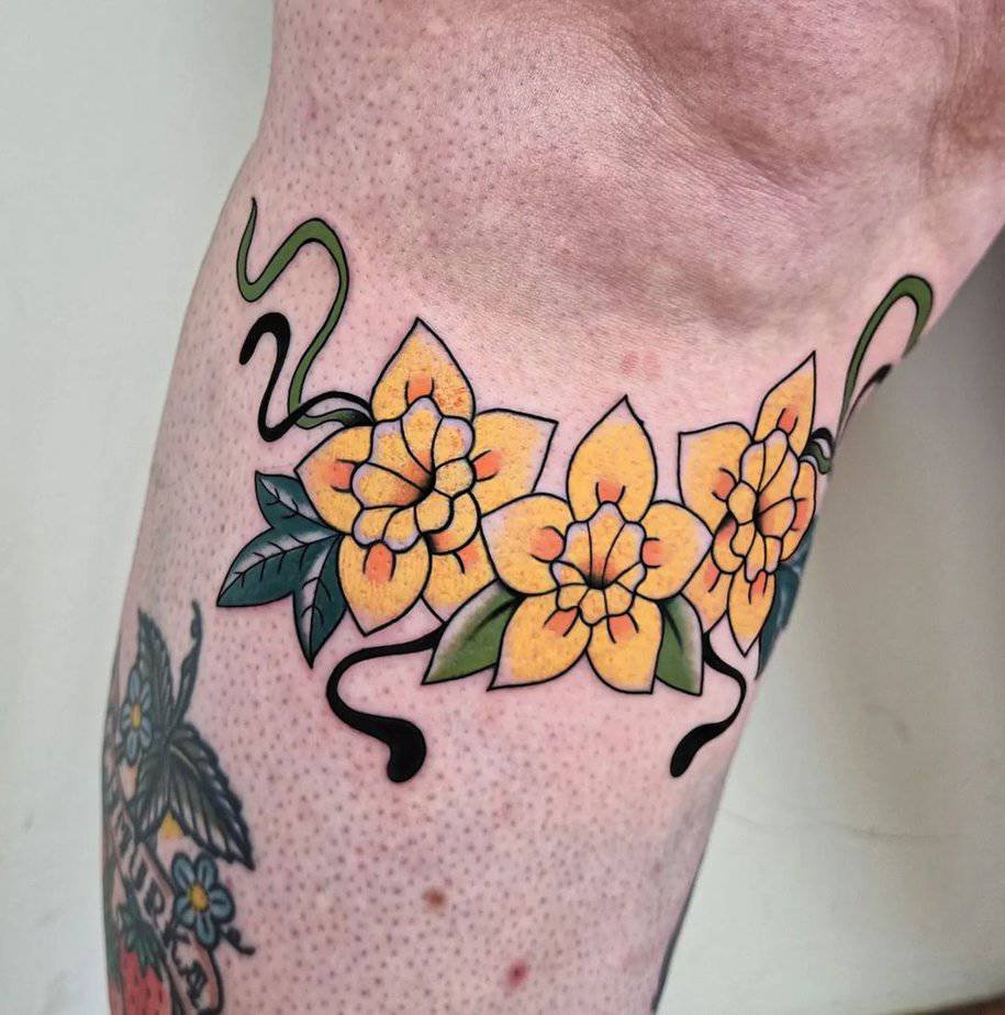 If you want something daring and full of personality, three traditional-style daffodils on the knee are show-stopping. Bright colors, bold lines — this is for folks who love making an entrance and wearing their art unapologetically.