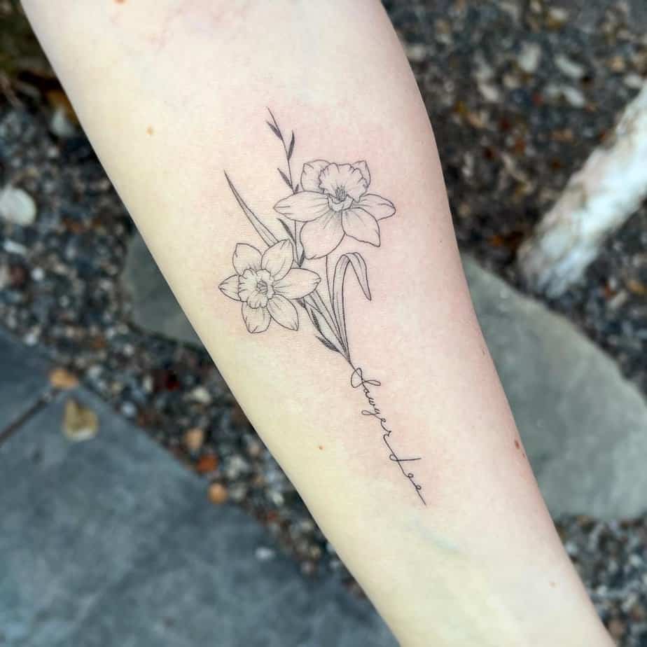 Want to make it personal? Add a name or a short phrase beside your daffodil. Black-and-gray tones keep the piece timeless and give it a gentle, heartfelt vibe — like quiet devotion inked onto your skin. It’s the kind of tattoo that nudges you to say what you feel, because life’s too short for holding things in.
