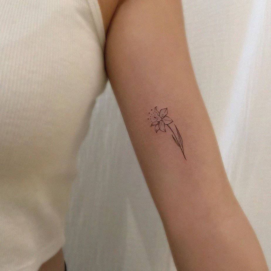 If you want something small but with real presence, a micro daffodil on the upper arm is quietly perfect. The fine-line style keeps it feminine and delicate, but it still reads as intentional — like a tiny talisman. I love that these flowers carry the meaning of good fortune, too; it's like a little promise that brighter days are coming, tucked right under your sleeve.