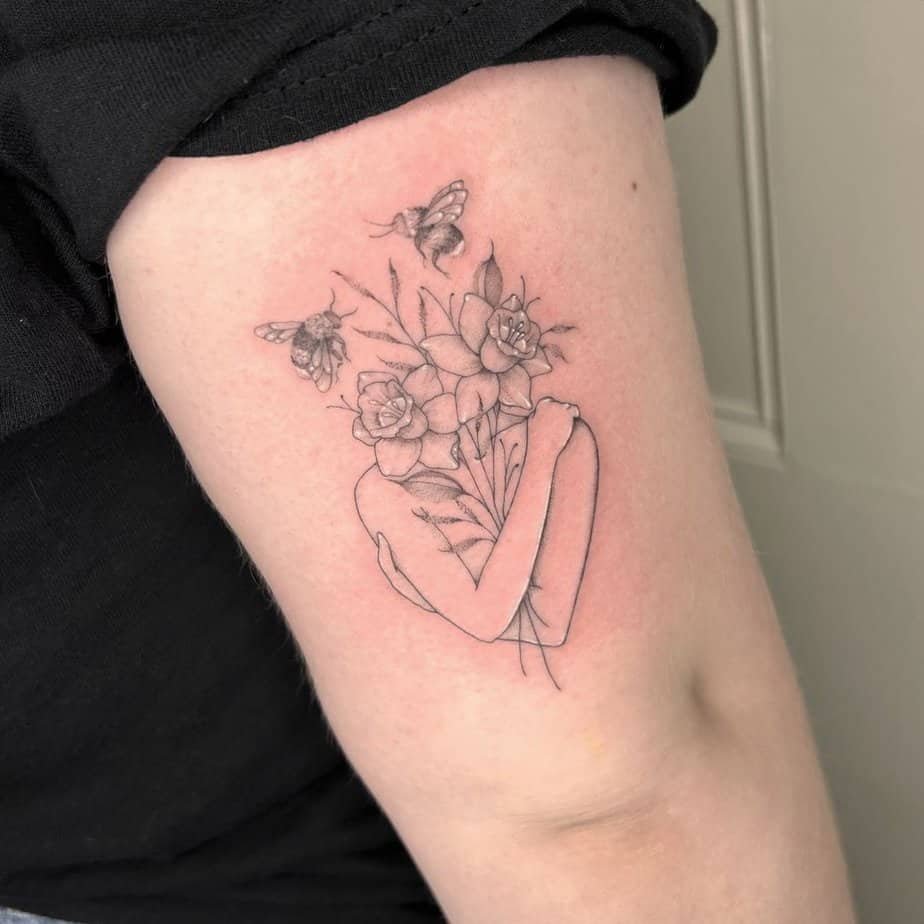 Here’s a sweet concept: a woman embracing herself, her head replaced by blooms, with bees drifting nearby. It’s symbolic of self-love and growth, a perfect little manifesto to wear where you can see it. The fine-line work keeps everything soft and tender.