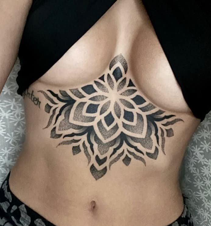 Sternum tattoos are a fan favorite for good reason. They’re center-stage but still controllable depending on what you wear. Dotwork here can be delicate and ornate, turning your décolletage into something like wearable jewelry.