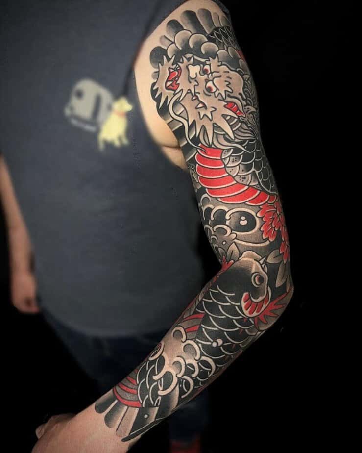 If you’re into delicate work, a fine-line dragon threaded through small florals gives contrast without being heavy. For realism fans, a gold-and-blue dragon that looks almost three-dimensional will have people doing double-takes. And if you love traditional Japanese styling, a sleeve with a dragon as the central character is a classic move — it wraps, it flows, it tells a story from every angle. Your arm can show off the whole narrative.