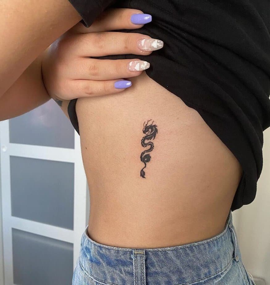 Ribs are intimate and a little dramatic — perfect for a small dragon that feels like your own talisman. A tiny, cartoonish dragon here reads sweet and protective. A black minimalistic dragon makes a crisp statement: even when tiny, dragons still carry weight.