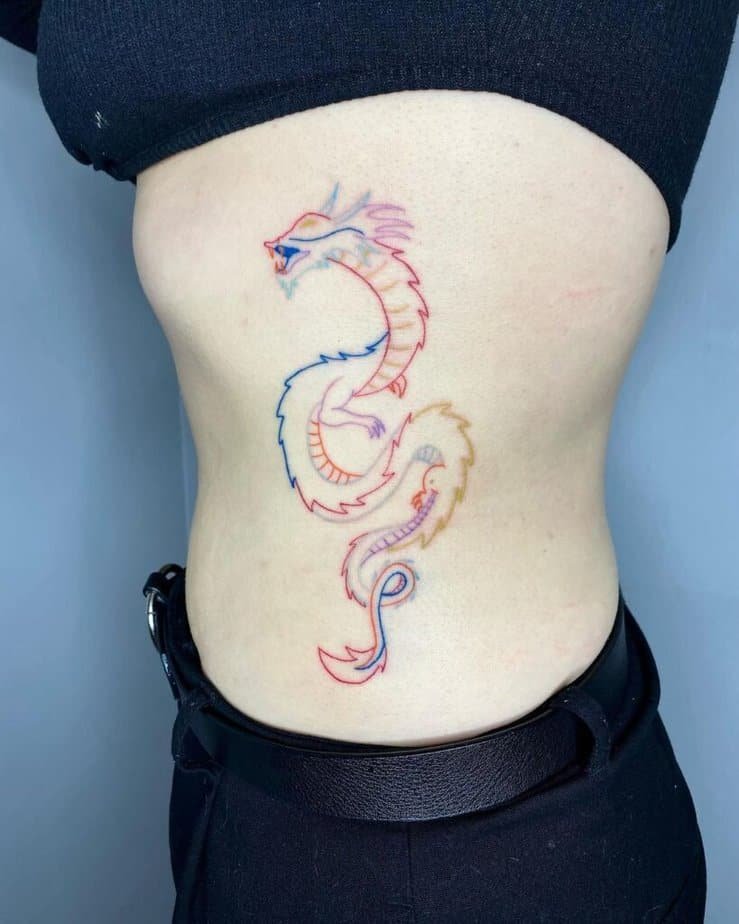 If you want unique, try a small abstract or graphic design that blends colors and shapes; it looks like wearable art. Graphic, colorful dragons are trendy, but not everyone wants that look — if you do, though, the ribs are a great place because it’s personal and can peek out when you want it to.