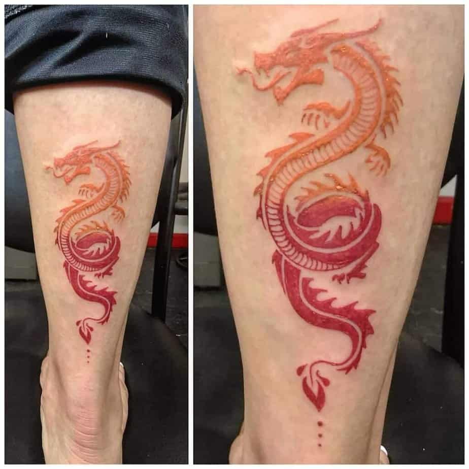If a huge commitment isn’t your thing, try a small black-and-red dragon just above the ankle — tucked and mysterious, but still powerful. If you want color, a gradient orange-and-red dragon down the calf is a wearable painting that people will notice and remember.