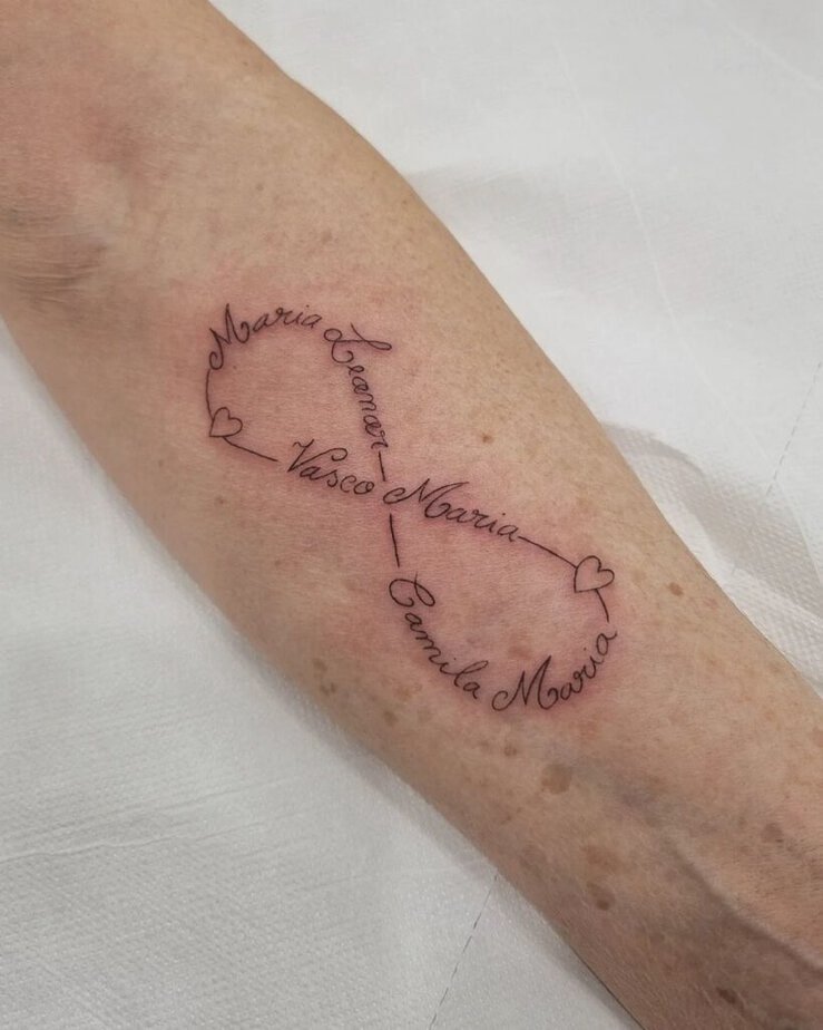 An infinity symbol made of family names is such a poetic option: endless love, and every person folded into that loop. It reads sweet and permanent — exactly the vibe most of us want when we honor our family.