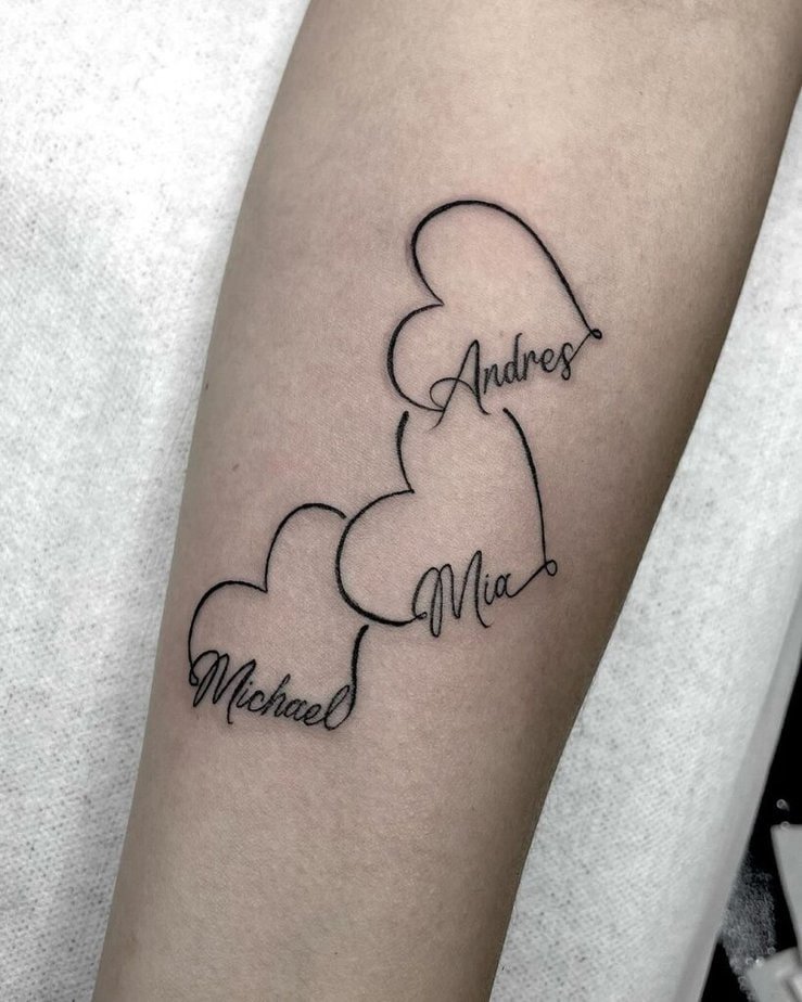 If you want to keep things clean and classic, names inside heart shapes are a forever-win. Add as many hearts as you need, mix sizes, tuck them along a wrist or chest — it’s simple and it’s real.