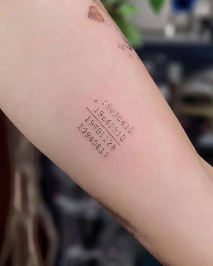 Okay, this one’s clever: an equation where your parents’ birth dates add up to your kids’ dates. It’s nerdy in the best way — a tiny puzzle on your skin that only your family might fully get. I love the idea of wearing an inside joke like that.