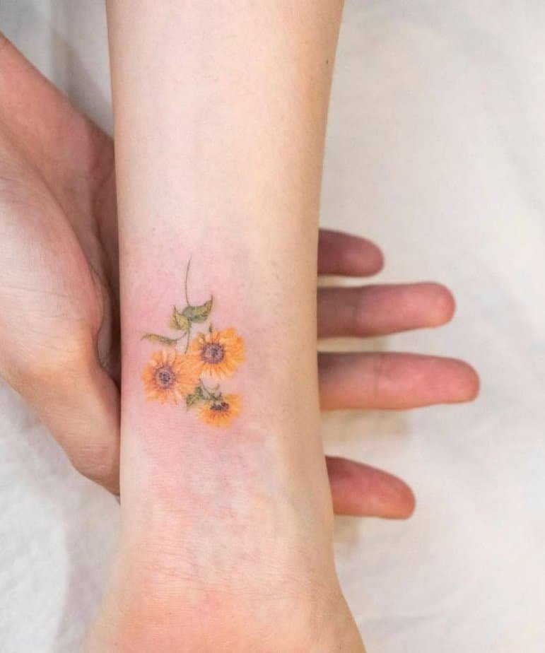 Three little sunflowers blooming from your wrist, radiating warmth. The orange petals feel almost sunlit, and since sunflowers stand for loyalty and adoration, this design is perfect if you love fiercely and wear your heart openly.