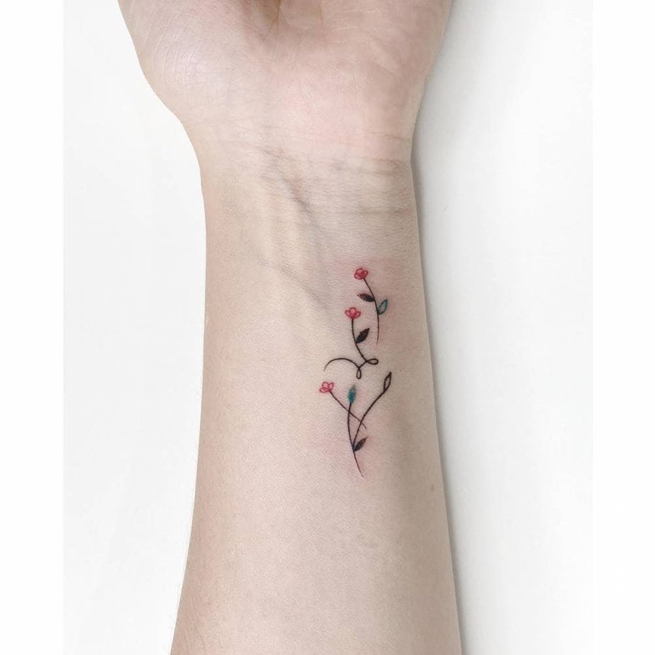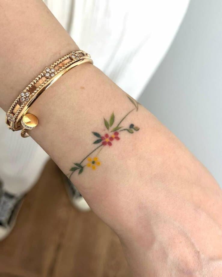 A thin vine circling the wrist with tiny red, yellow, and green blooms — cheerful but subtle. It’s minimal enough for someone who likes a clean aesthetic, but the color keeps it lively and interesting.