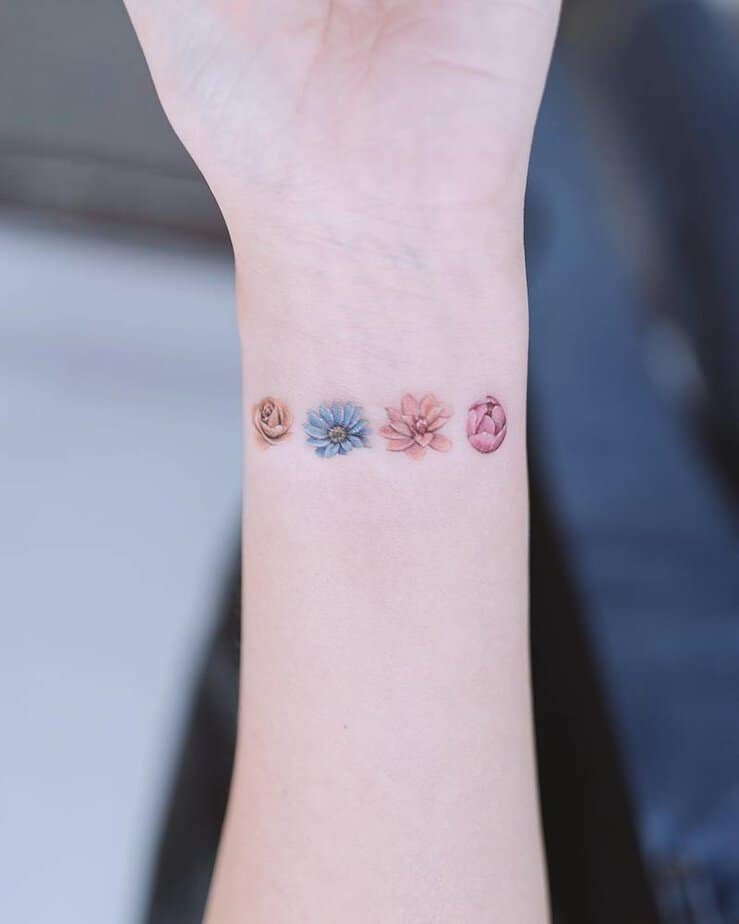 Can’t choose a favorite flower? Bring them all. This design shows four different blooms in soft pastels — a rose, a daisy, and their pals — like a tiny garden wrapped around your wrist. It’s playful, pretty, and somehow feels like wearing a little bouquet every day.