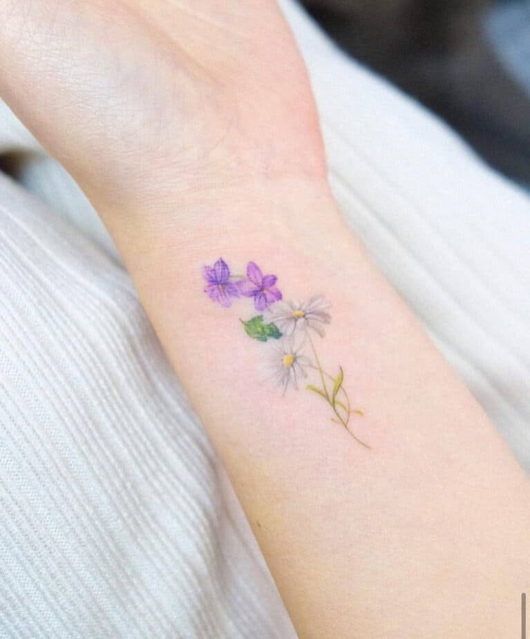 Soft purples and whites give this one such a meadowy feel, like you just tucked a handful of wildflowers into your sleeve. It’s delicate and natural, the kind of tattoo that reads gentle and effortless.