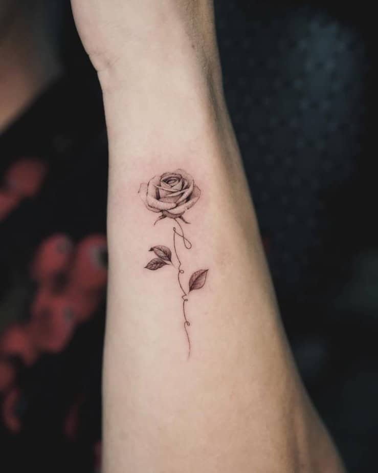 The rose never goes out of style, and here it’s paired with a thin vine that curves into the word “love.” Soft but with presence, this design feels both romantic and timeless — the kind of tattoo that reads like a small, steady promise.