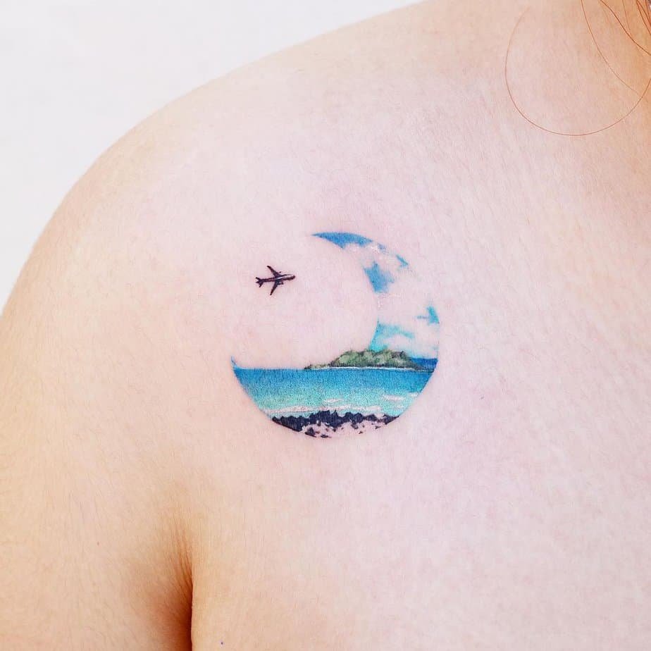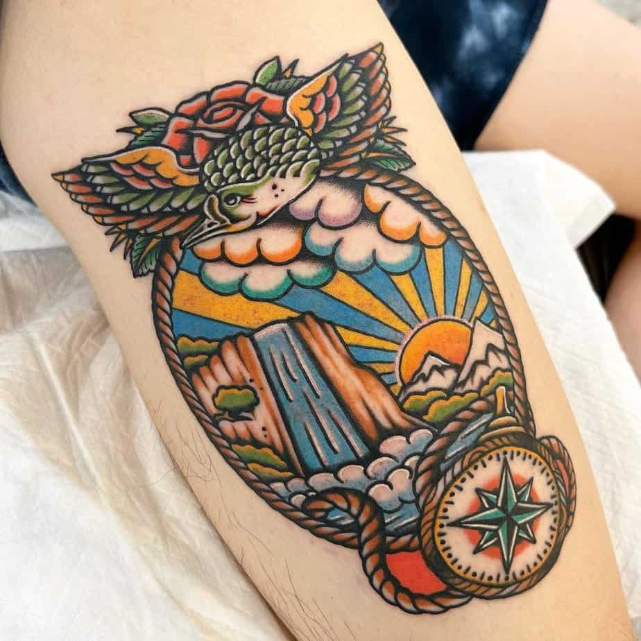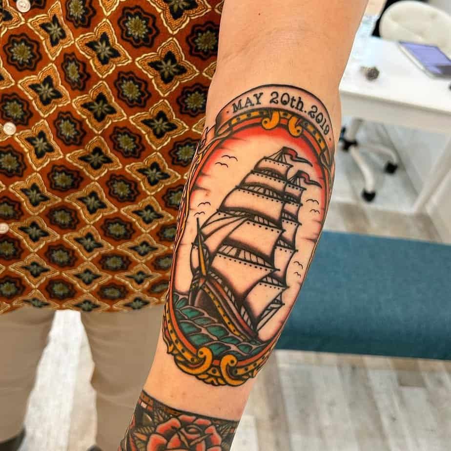 A traditional ship tattoo framed like this feels nostalgic and adventurous. Bold colors and sharp lines make it pop, and the symbolism is classic: a reminder to chase horizons and welcome unexpected beauty on the journey.