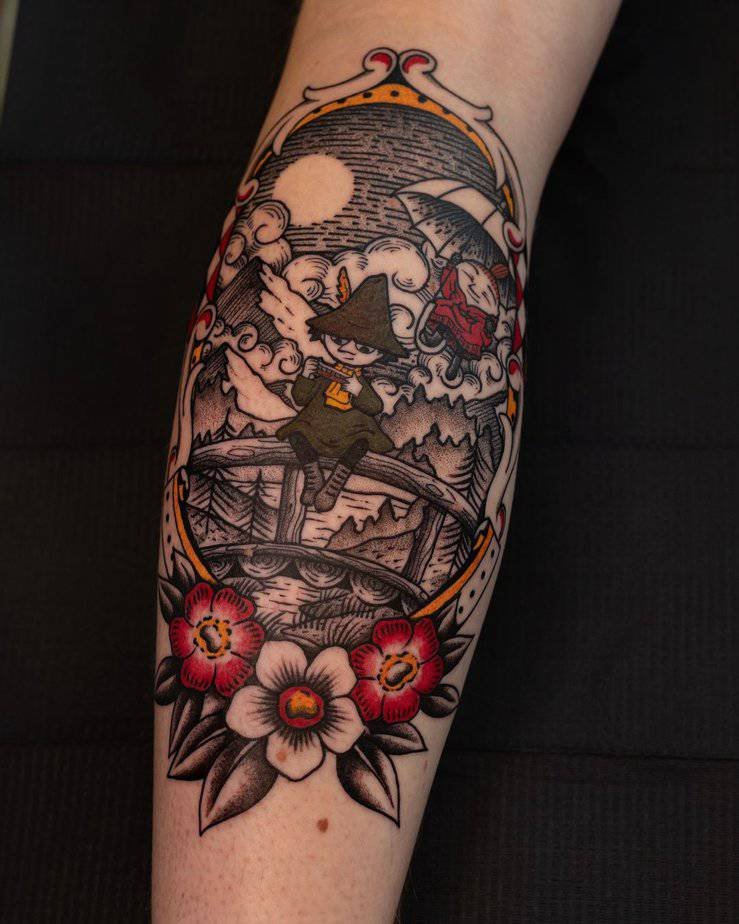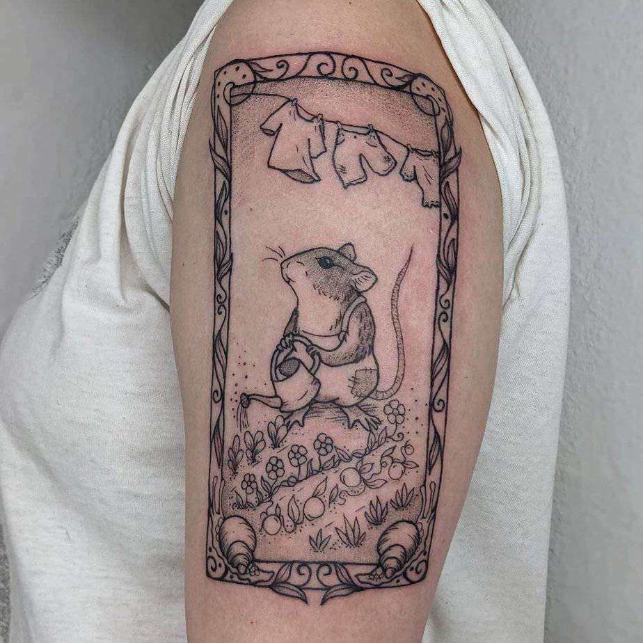 Okay, this one is pure sweetness: an upper-arm mouse in little clothes watering its flower garden. It’s whimsical in the best way, like a storybook page you could wear. Mice here feel playful and curious, nudging you to notice small wonders, and the black-and-gray palette with delicate dotwork gives the whole thing lovely depth.
