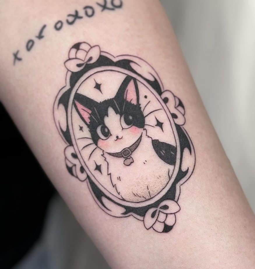 This framed cat is pure soft energy — mostly blackwork with a tiny pink accent that makes it feel like a gentle nod to your favorite furry companion. Cat tattoos carry that vibe of independence and quiet strength, like a little permanent reminder to trust your own company and instincts.