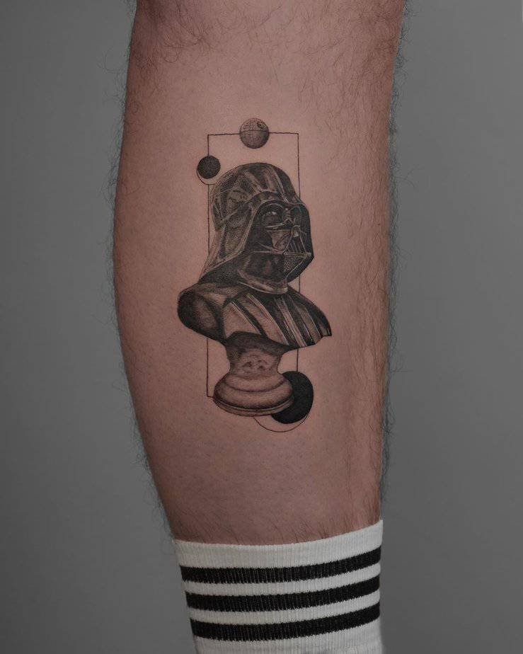 Sith lord energy in a frame. This Darth Vader piece mixes dotwork with black-and-gray shading and sits on the calf where it really makes a statement. If Star Wars is a language you speak, this is a great way to say it out loud (but stealthily).
