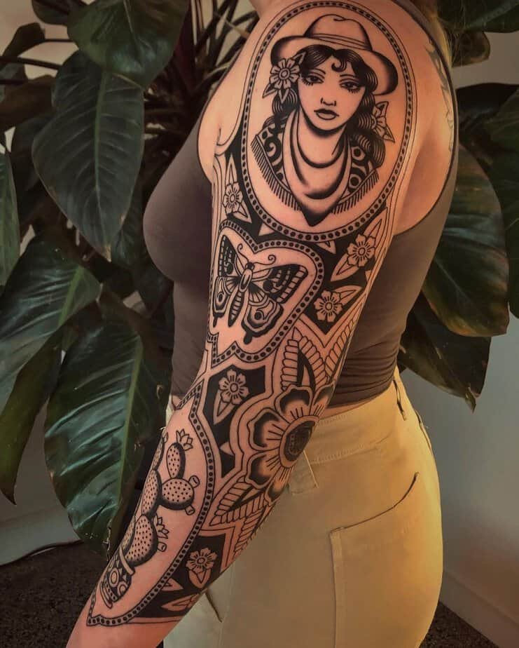 If you’re thinking bigger, a framed sleeve like this is gorgeous — it stitches together motifs (cowgirl, butterfly, flowers) that speak of beauty, growth, and transformation. It’s bold blackwork and feels like a wearable narrative: change isn’t scary, it’s part of the art.