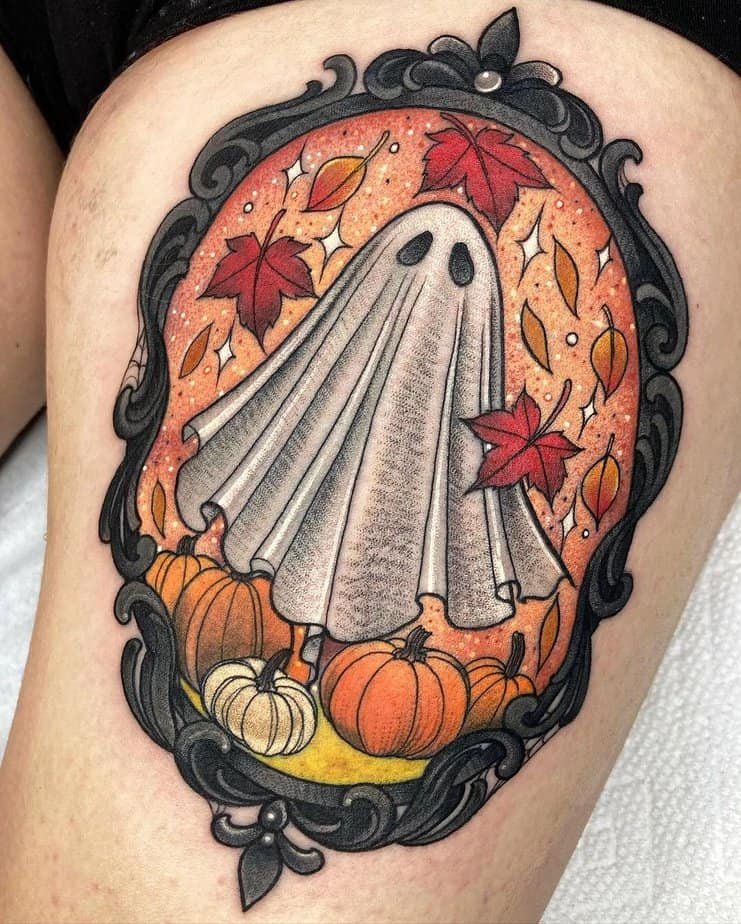 If you live for fall, this ghost-with-pumpkins vignette is the vibe. Bright oranges and autumn leaves make it warm and festive, and the thigh placement keeps it easy to hide or show depending on the season — like a little Halloween secret you wear year-round.