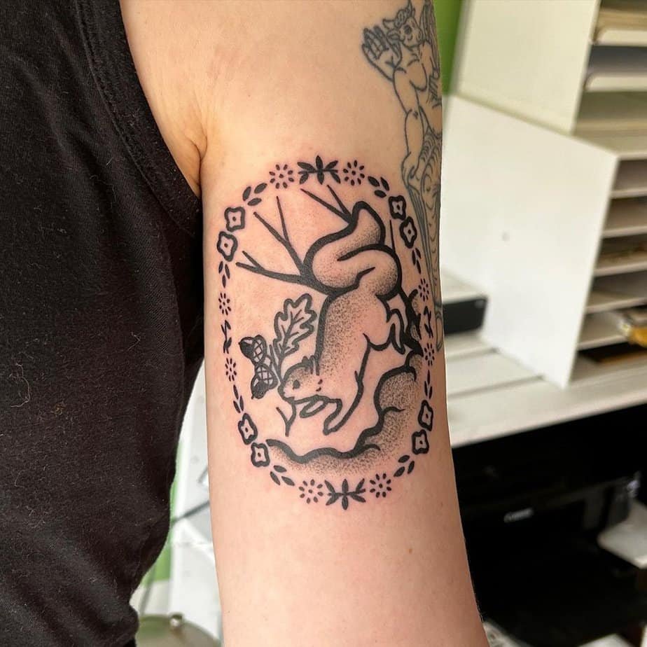 Cute and chipper: a forearm dotwork squirrel tucked into a floral frame. It’s lighthearted and reminds you to hold onto small joys and playful moments — perfect if you want something that lifts your mood.