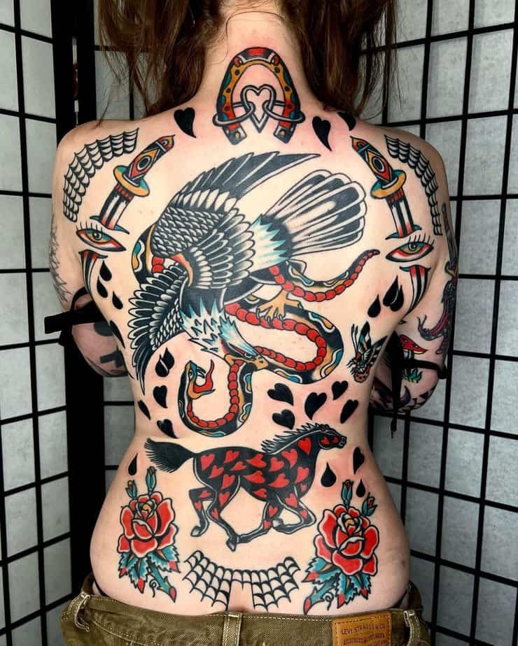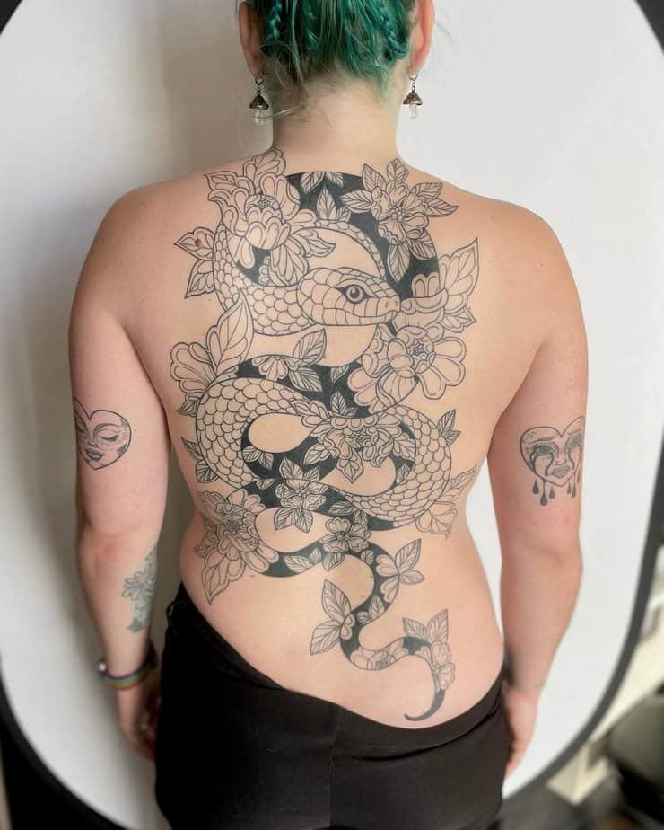 A snake slithering across the back mixed with florals gives you both movement and softness. It’s a classic combo that can symbolize transformation, protection, or just look stunning as a composition.