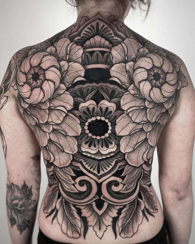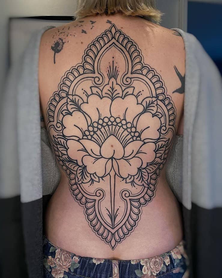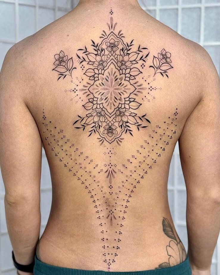 Ornamental tattoos are perfect for the back because they're symmetrical and full of detail — two things that really pop on that wide canvas. It's classy, almost architectural, and somehow both delicate and bold at once. Picture it centered down your spine so every little flourish sits just right. Does that vibe with you?
