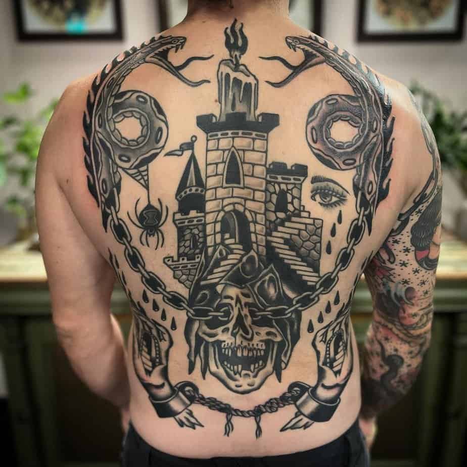 Skulls, castles, snakes — this one leans into the gothic, the mysterious, and the slightly haunted. If your aesthetic is dark-romantic or simply edgy, this reads like a full narrative you can wear.