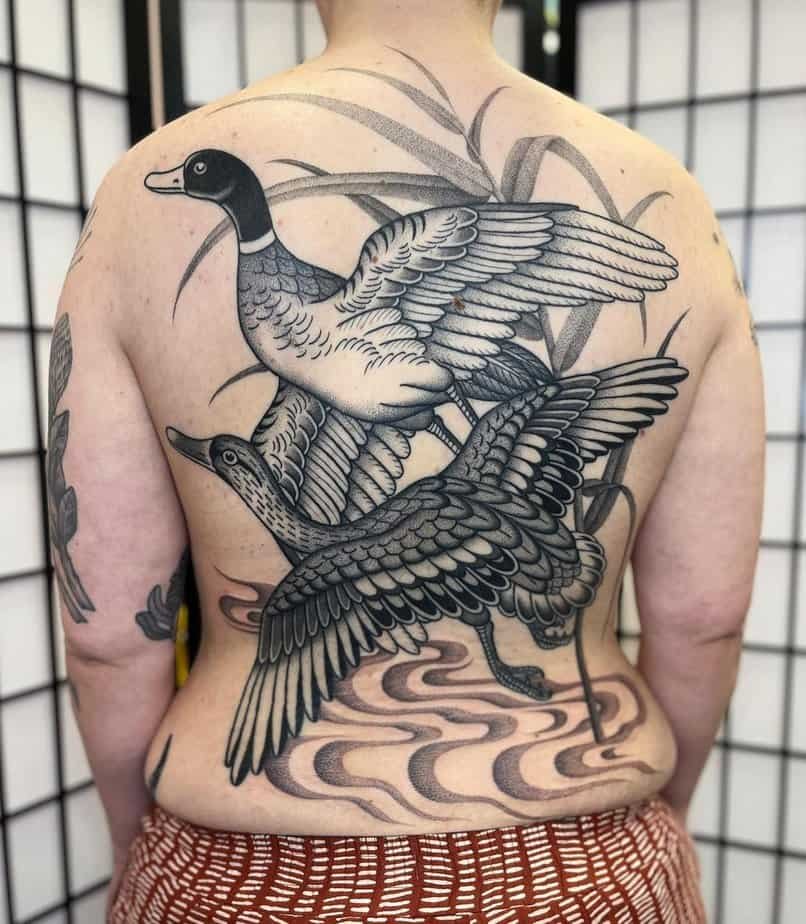 Animals make beautiful symbols. These geese, for example, can represent family and belonging — a lovely way to make your back feel personal and meaningful while still being visually striking.