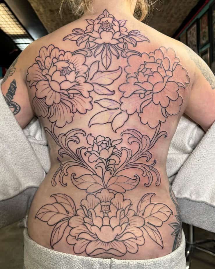 Flowers don’t have to be soft or tiny. Scatter them across your back with bold lines and contrast, and they become daring instead of delicate. Feminine energy with an edge — yes please.