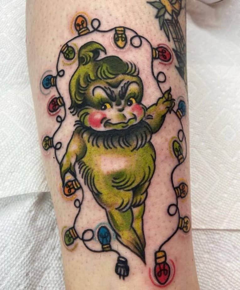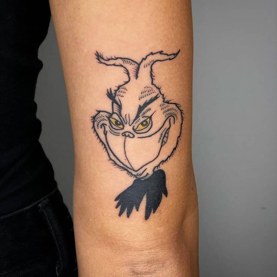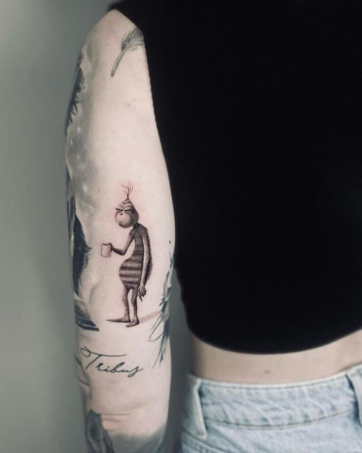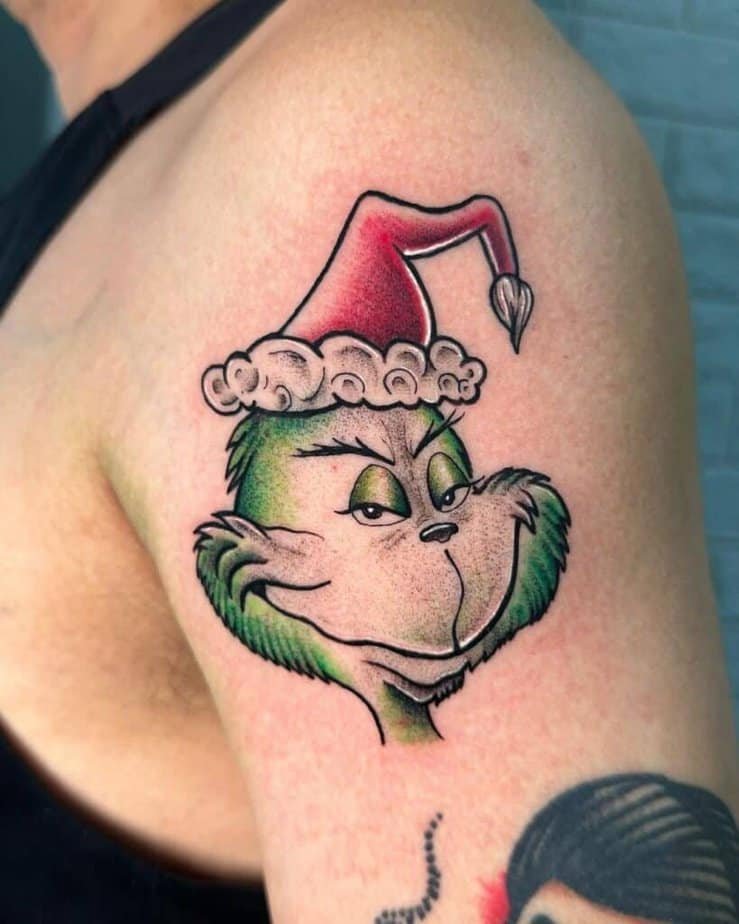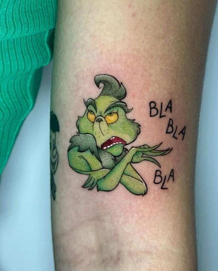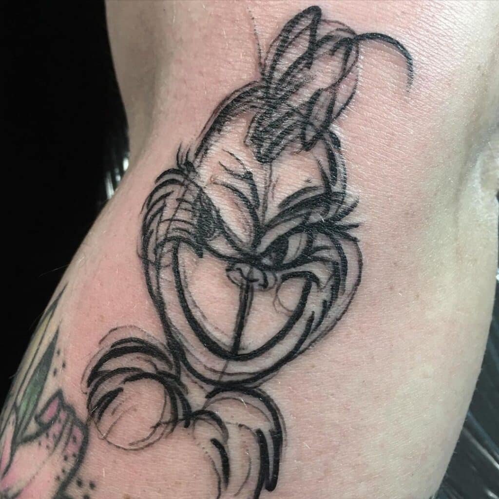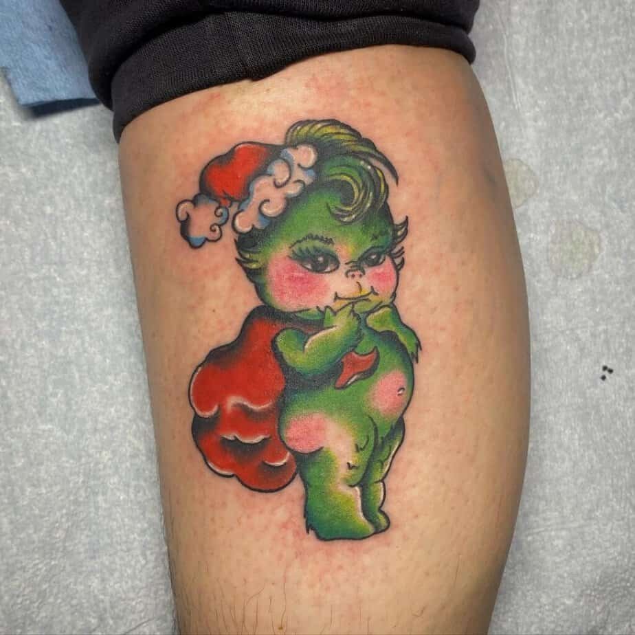 Okay, so here’s the vibe: sometimes you wake up and the world is just a nonstop loop of “cheer, cheer, cheer,” and you’re like, “Blah, blah, blah.” That’s the Grinch energy, and honestly, it’s perfect for a tattoo. If you want something cute, a baby Grinch is adorable and reads immediately as a classic tattoo — tiny, cheeky, and full of personality. If color isn’t your thing, you can go full black ink; the Grinch’s scowl translates beautifully to a monochrome piece and still gives off the exact amount of attitude you want.
